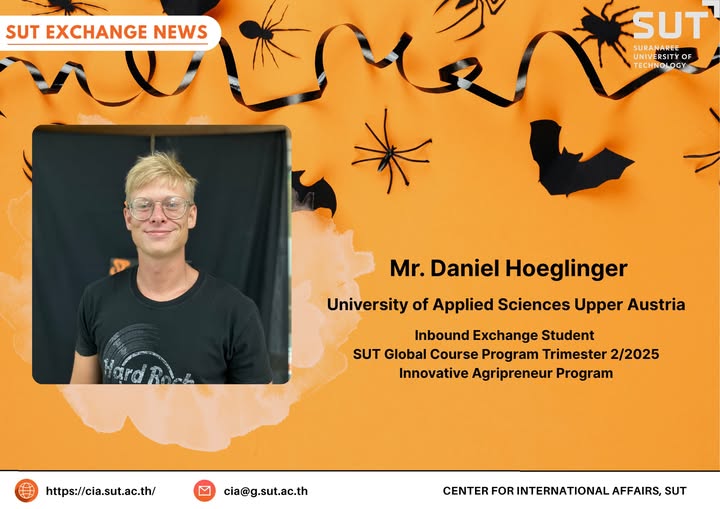 The Center for International Affairs is pleased to announce the arrival of Mr. Daniel Hoeglinger, an undergraduate student from the University of Applied Sciences Upper Austria, who will participate in the Inbound Exchange Program at Suranaree University of Technology for Trimester 2/2025. Mr. Hoeglinger will be enrolled in the Innovative Agripreneur Program under the SUT Global Course, which focuses on agricultural innovation and entrepreneurship development. This exchange reinforces the strong academic partnership between SUT and the University of Applied Sciences Upper Austria, promoting international collaboration in higher education. The program provides students with opportunities to engage in cross-cultural learning while developing expertise in sustainable agriculture and agribusiness innovation.
