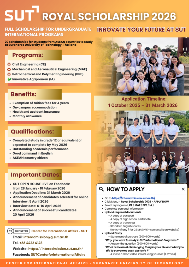 Call for applications SUT Royal Scholarship Program 2026 20 scholarships for students from ASEAN countries to study atSuranaree University of Technology, Thailand