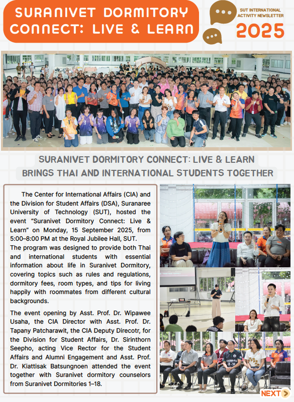 El Centro de Asuntos Internacionales (CIA) y la División de Asuntos Estudiantiles (DSA) de la Universidad de Tecnología de Suranaree (SUT) organizaron el evento “Suranivet Dormitory Connect: Live & Learn” el lunes 15 de septiembre de 2025, en el Royal Jubilee Hall, SUT.