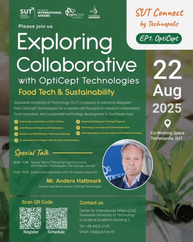 Suranaree University of Technology (SUT) will host a special collaboration event with OptiCept Technologies on August 22, 2025, focusing on food technology innovation and sustainability research in Southeast Asia.
