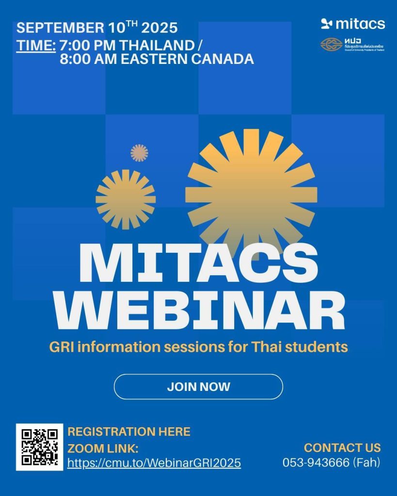 The Center for International Affairs (CIA), Suranaree University of Technology (SUT) invites SUT students, faculty, staff, and interested individuals to join an online information session about the Mitacs Globalink Research Internship (GRI) program on September 10, 2025, at 7:00 PM Thailand time (8:00 AM Eastern Canada).
