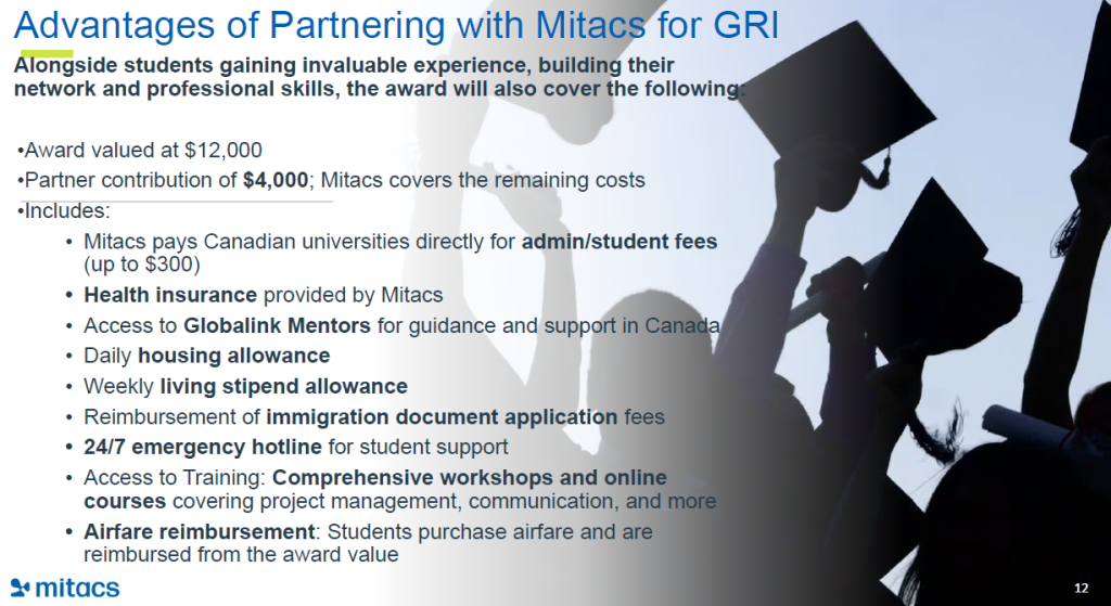 The Globalink Research Internship offers comprehensive benefits including up to CAD 12,000 funding that covers air travel, health insurance, living allowance, housing support, and mentorship. Students are matched with Canadian faculty supervisors at universities across Canada, providing hands-on research experience and opportunities to build academic and professional networks.