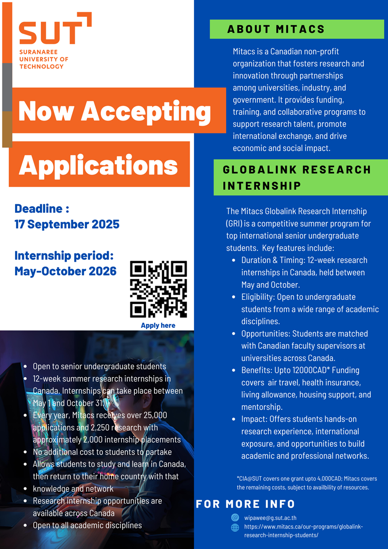 For more information and applications, contact wipawee@g.sut.ac.th or visit https://www.mitacs.ca/our-programs/globalink-research-internship-students/